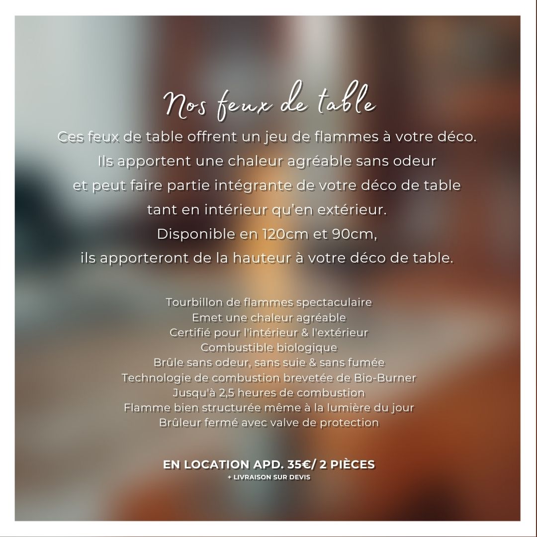Ce feu de table offre un jeu de flammes à votre déco. Il apporte une chaleur agréable sans odeur et peut faire partie intégrante de votre déco de table tant en intérieur qu’en extérieur. Disponible en 120cm et 90cm, il apportera de la hauteur à votre déco de table.