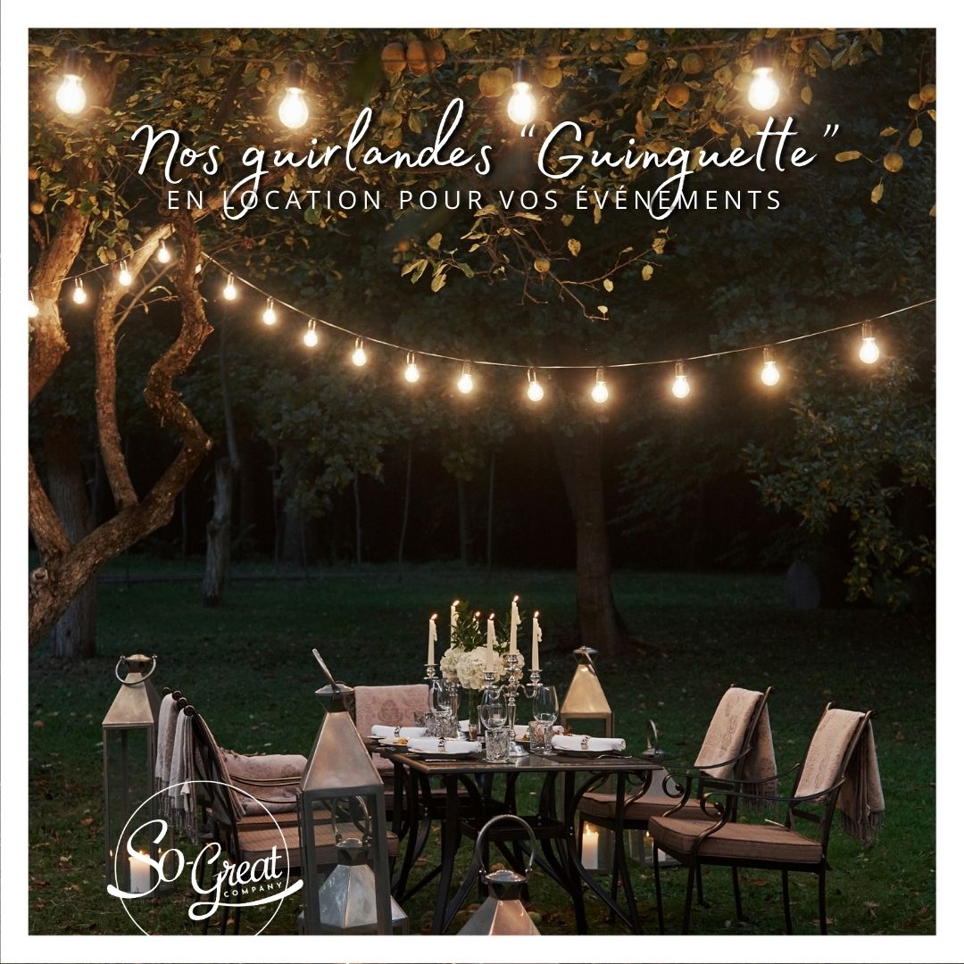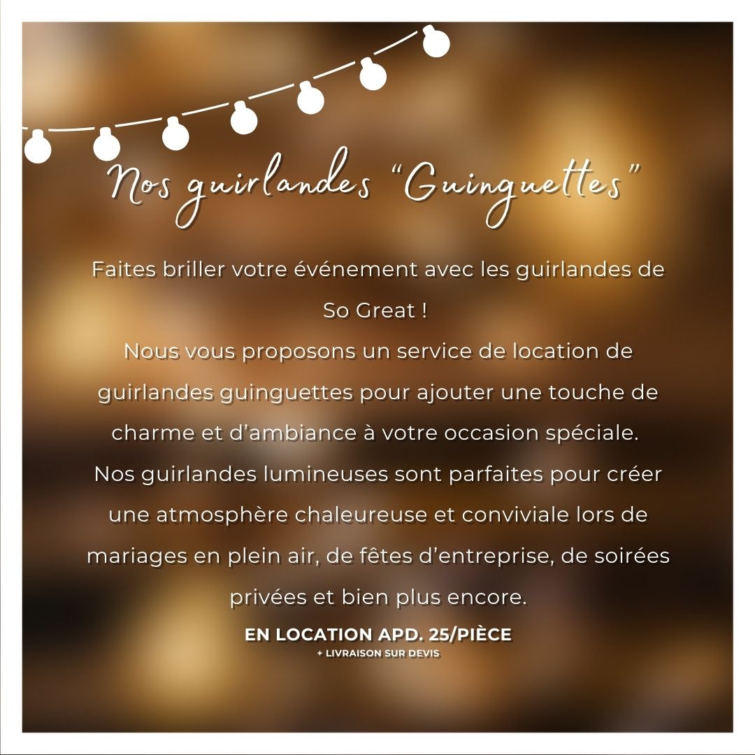 Faites briller votre événement avec les guirlandes de So Great ! Nous vous proposons un service de location de guirlandes guinguette pour ajouter une touche de charme et d’ambiance à votre occasion spéciale. Nos guirlandes lumineuses sont parfaites pour créer une atmosphère chaleureuse et conviviale lors de mariages en plein air, de fêtes d’entreprise, de soirées privées et bien plus encore.